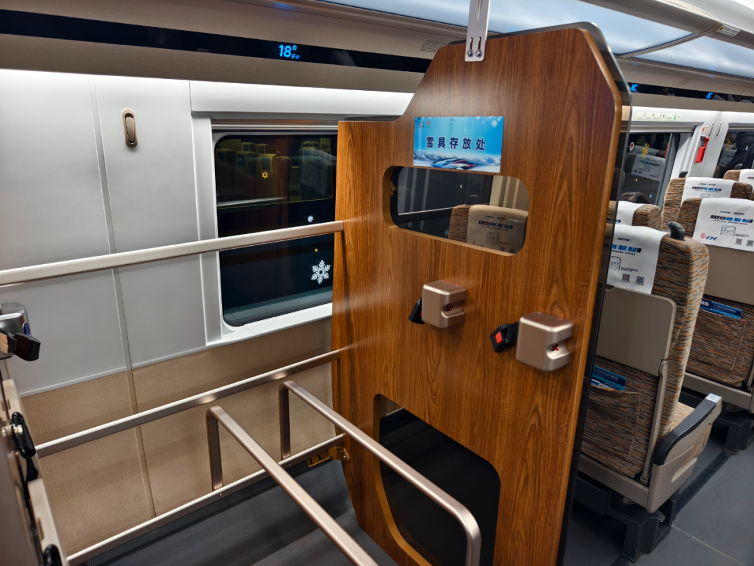 為了更好滿足旅客與雪具隨車同行的需求,鐵路部門統籌考慮旅客安全、乘車秩序和雪具運輸需求,選取京張高鐵北京北至崇禮間的G7831/2/3/4/5/6/7/8次列車試點開展“雪具便利行”服務,對動車組列車二等座車廂部分座椅進行了適應性改造,設置專門的“雪具存放處”,旅客選擇該服務后可攜帶長、寬、高之和不超過200厘米的雪具同車出行,滑雪更加方便快捷。對于長、寬、高之和超過200厘米的雪具,由于高鐵列車車內空間限制,仍需辦理托運。