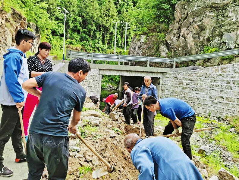 △5月27日,陜西省人社廳駐丹鳳縣武關(guān)鎮(zhèn)陽陰村扶貧干部發(fā)動群眾50多人,根據(jù)當(dāng)?shù)赜欣貏蓍_展引水工程,該工程的實施可解決全村45戶200多口人畜季節(jié)性干旱飲用水以及部分糧田抗旱問題。(鄭志財 攝)