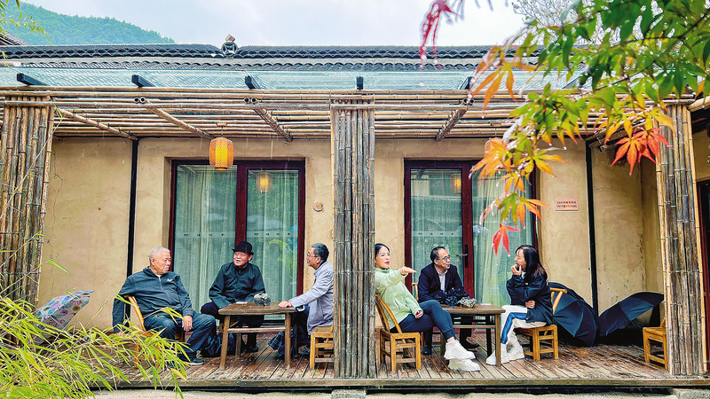 在柞水縣營盤鎮(zhèn)朱家灣村的特色民宿陽坡院子里,散文名家們在雨中暢談。 (本報(bào)記者 米子揚(yáng) 攝)