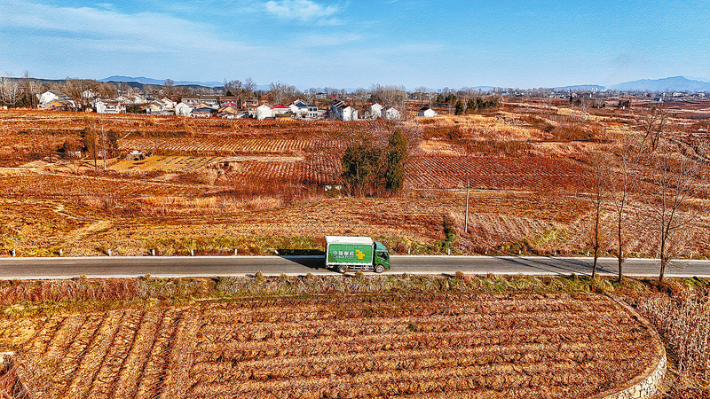 △彎彎的郵路連通城鄉,郵車進村入戶將快遞和幸福一并送到千家萬戶。圖為一輛郵車行駛在洛南縣景村鎮的村道上。