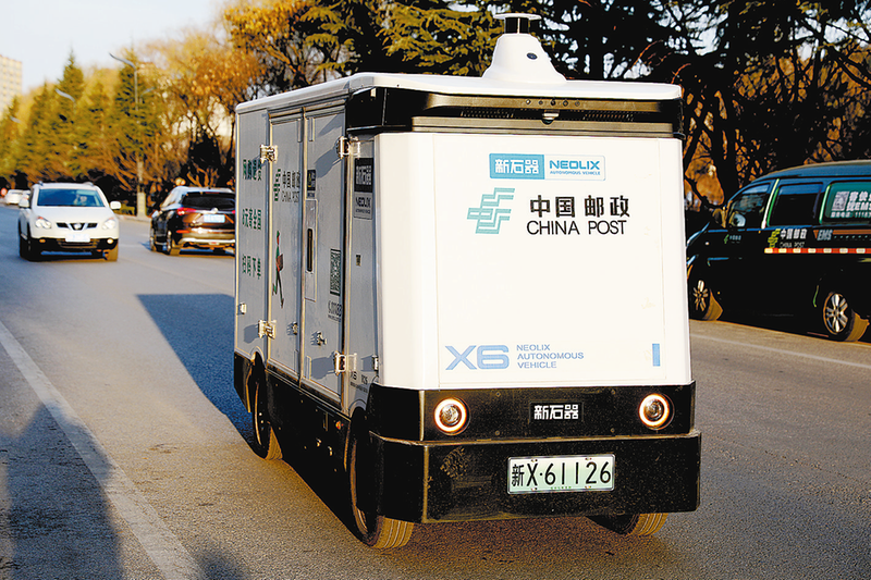 △全市布放的12臺無人投遞車,讓快遞員包裹交接距離縮短38%,單日配送量提升30%以上。圖為洛南縣城道路上正在行駛的郵政無人快遞車。