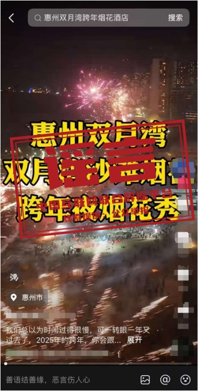 真相:近期,網絡上出現(xiàn) “廣東惠州雙月灣2025跨年煙花秀”“2025雙月灣跨年倒數(shù)夜”“雙月灣跨年煙花秀”等信息,引發(fā)關注。經相關部門核實,網傳信息均系不實信息。目前廣東省惠州市惠東縣雙月灣沒有舉辦2025年跨年煙花秀活動的安排,請廣大游客不聽謠、不信謠、不傳謠,一切以官方發(fā)布信息為準。(來源:“惠州日報”微信公眾號、惠東文旅體)