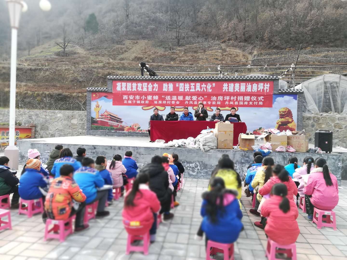 2018年1月19日,西安市小蜜蜂慈善公益組織負責人汪女士,攜手丹鳳縣煙草局黨支部、丹鳳縣國庫支付局黨支部暨花瓶子鎮政府,冒著嚴寒,從西安省城來到油房坪村,開展“送溫暖、獻愛心”溫暖衣發放儀式,對30名留守兒童發放羽絨服、保暖內衣、圍巾、耳套、鞋子、裙子等價值1萬余元物品,用實際行動詮釋著人間最質樸的愛,受到捐贈的留守兒童,他們非常感謝黨和人民的關懷以及社會這么多好心人為他們送去的衣物,在以后的生活學習中,學會感恩,以優異的成績回報各級領導以及社會的關懷。