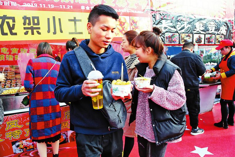 在農(nóng)特產(chǎn)品展臺的東側(cè),各類網(wǎng)紅美食吸引著顧客的味蕾。烤肉小哥隨著音樂的節(jié)奏快樂地把肉烤得焦香,鐵板豆腐和香蔥、辣椒一起發(fā)出“滋滋”的響聲……色香味俱全的美食琳瑯滿目,光是看著就已經(jīng)大飽眼福。攜三兩好友,吃完長沙臭豆腐,再品上一串黃金蝦球,前方還有更美味的網(wǎng)紅美食在等待。