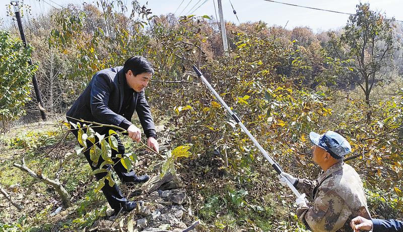近日,李德俊(左)與山西核桃科管師傅在種植基地交流秋冬季核桃修剪技術。