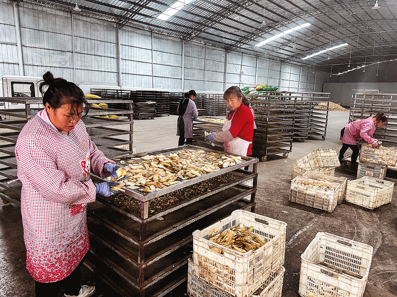 傳明中藥材種植農民專業合作社的天麻切片加工廠內,工人正在晾曬天麻。