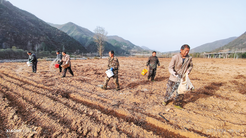 11月24日,商南縣金絲峽鎮畢家灣村楊家臺子組村集體產業基地里,村民正在撒化肥和種子。