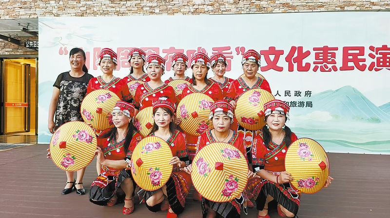 曹淑娥(后排右二)編排的節目《阿瓦人民唱新歌》在山陽縣翠屏山公園演出。