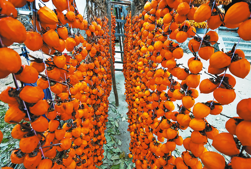 這些被村民高高掛起來進行晾曬的柿子,每個都已經被去了皮,將被制作成柿餅。去皮就是用傳統的手工去皮刀,將七八成熟的柿子表面削除。據村民介紹,柿子光滑的表皮具有一定的澀味,削除表層后通過晾曬、上霜,柿子更加甘甜可口、有韌性。