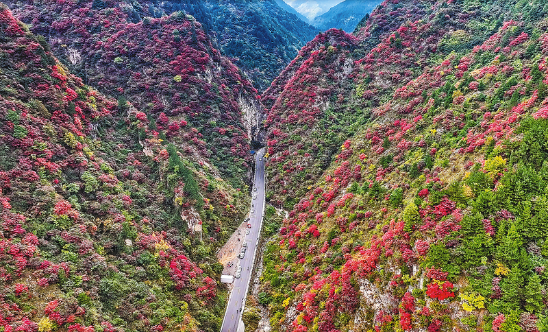 金秋時節(jié),秦嶺紅葉即將進入最佳觀賞期。十月十五日,位于312國道商州區(qū)牧護關(guān)鎮(zhèn)峽口段的山間正悄然披上斑斕彩衣,紅葉似火的秋日美景吸引了大批游客驅(qū)車前往觀賞。 (本報記者 楊 鑫 攝)
