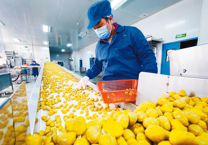 11月27日,在陜西合曼農業科技有限公司板栗產品加工生產線上,工人正在進行板栗清洗、切口、分揀、降溫等工序。鎮安縣是全國板栗主產區之一,主推品種為鎮安1號,今年種植面積60多萬畝,收獲板栗1.1萬噸,總產值可達1.4億元。 (本報通訊員 倪方海 攝)